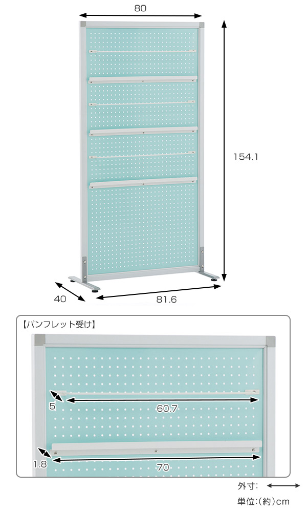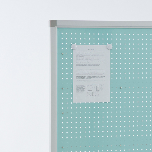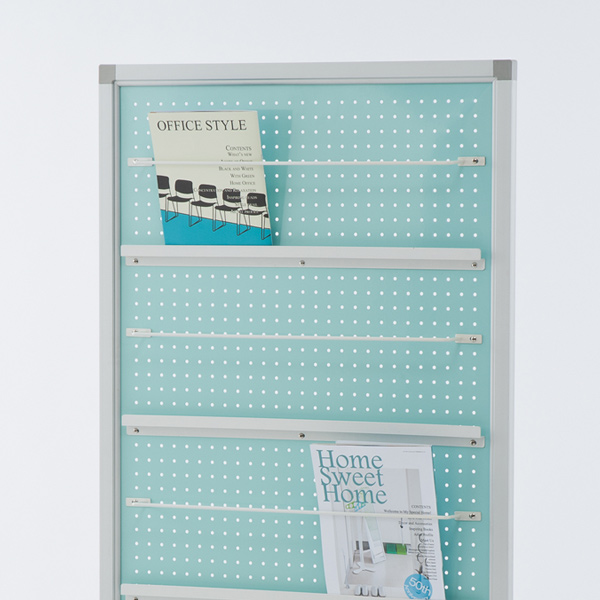 パネル面はスチール製なので、どちらの面でもマグネットを使用できます。パンフレット受けとマグネットを組み合わせれば、ディスプレイ方法が広がります。オフィス内での掲示板としてもおすすめです。また、パンチング穴を利用してフックなどを掛ければ、小物収納としても便利です。