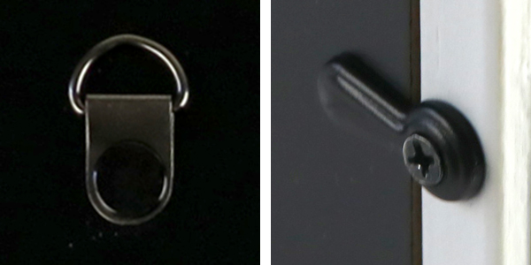 | 壁掛け用フック 裏板の上部2ヶ所に壁掛け用のフックが付いています。 | 留め具 裏板の上下左右に留め具が付いています。 |