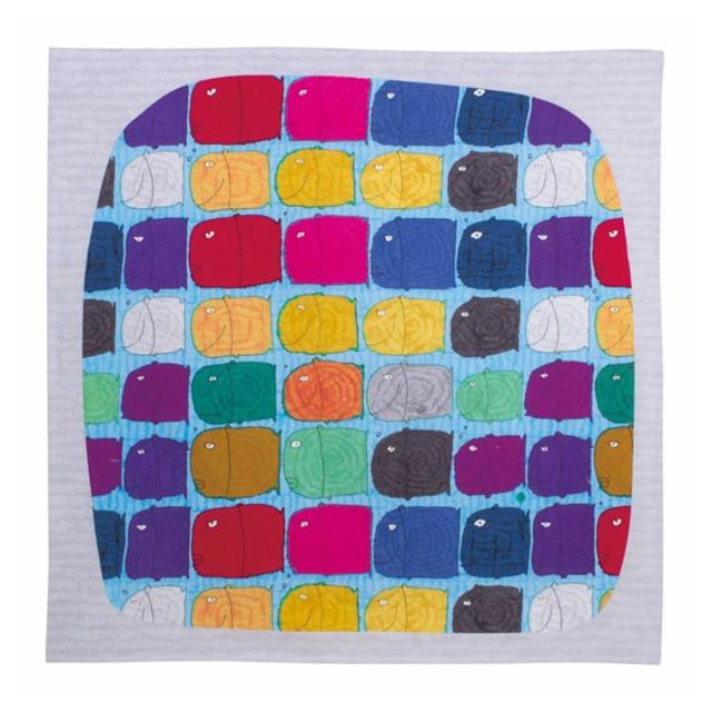 独自の視点やデフォルメによるユーモア溢れる作品が特徴の服部憲政さんがデザインした風呂敷です。サインペンで円を描くように描かれた魚たちの表情が愛くるしいデザインです。