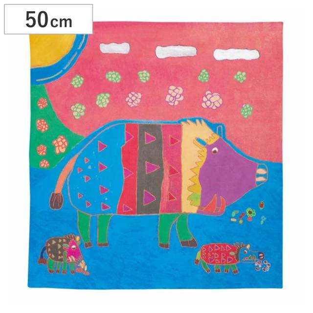 サイズは50cm×50cmですのでご使用用途に合わせて包み方を変えることが出来ます。ドロップバックやティッシュケース、本カバーとしてもご使用いただけます。また、アート作品として壁にかけてお使いいただくとお部屋がポップな雰囲気になります。