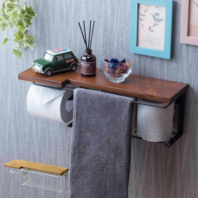 トイレットペーパーホルダー 棚付 天然木 ストックタイプ 幅44cm ダークブラウン ( ペーパーホルダー トイレットペーパー 2ストック 棚 棚付き 小物置き トイレ ペーパー収納 ホルダー ペーパー押さえ おしゃれ )