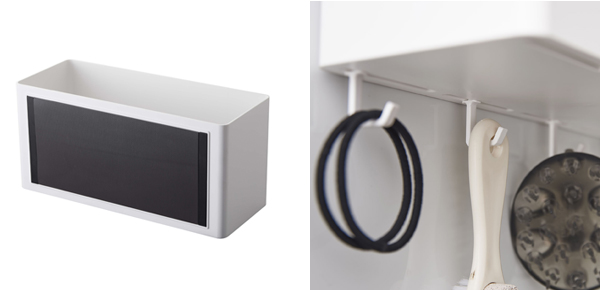 | 気軽に使えるマグネット式 大きなマグネットでしっかり支えるので安定感があります。(耐荷重:約3kg) | フック付き 引っ掛け収納に便利なフック4個付きです。(本体同色) |
