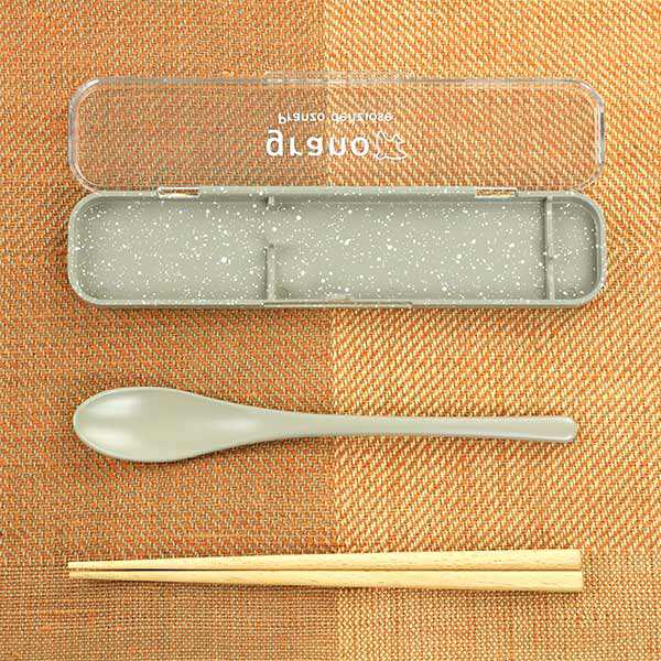 箸とスプーンのカトラリーセットです。ケースは、ひとつひとつ手作業による塗仕上げなので、同じ表情がない1点ものです。シンプルなストーン調のデザインなので、年齢問わず幅広い方におすすめです。蓋には可愛らしいロゴがプリントされています。