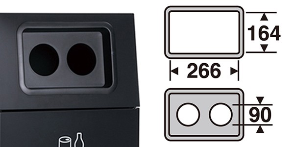 | 再生素材を使用 投入口は軽くて強い、再生樹脂のポリプロピレンが使われています。 | 投入口サイズ 上は一般ごみ用などの長方形の投入口のサイズです。下はあきかん用などの投入口のサイズになります。 |