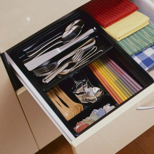 ●カトラリー類をすっきり収納できるスライド式整理トレーです。
