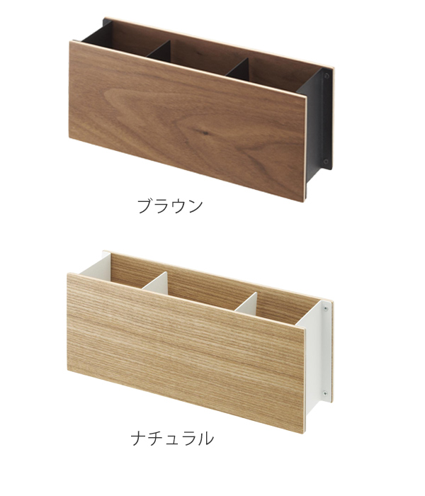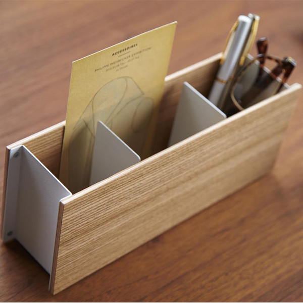 仕切り部分に工夫がしてあり、ウッド面の片側に少しスペースがあります。手紙やDM、忘れがちな請求書などを収納するのにオススメです。また、どこに置いても邪魔にならないコンパクトサイズなので、限られたスペースでも有効にお使いいただけます。