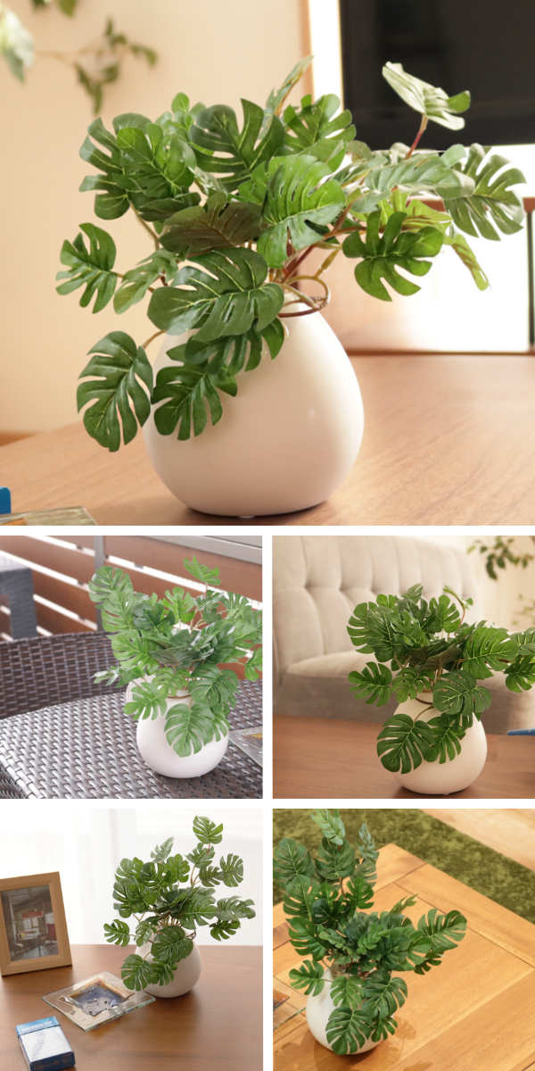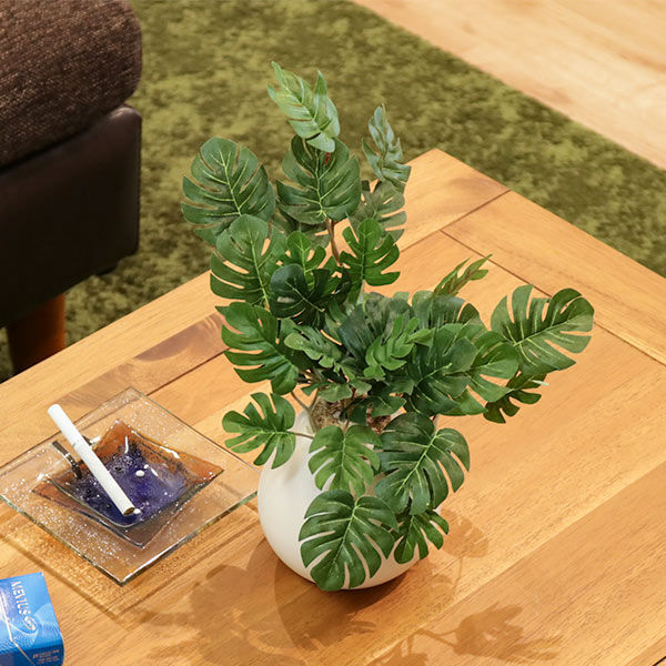 光触媒加工がほどこされたモンステラのフェイクグリーンです。太陽光や照明などの光によって化学反応を起こし抗菌消臭効果が期待できます。タバコを吸われる方やペットを飼っているご家庭にもおすすめです。
