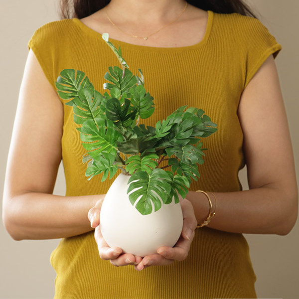 いきいきとした爽やかなグリーンでどんなお部屋にも馴染みやすいです。ボリュームのある葉で置くだけでお部屋に彩りを加えてくれます。ころんとしたフォルムがかわいらしいホワイトのポットに入っています。