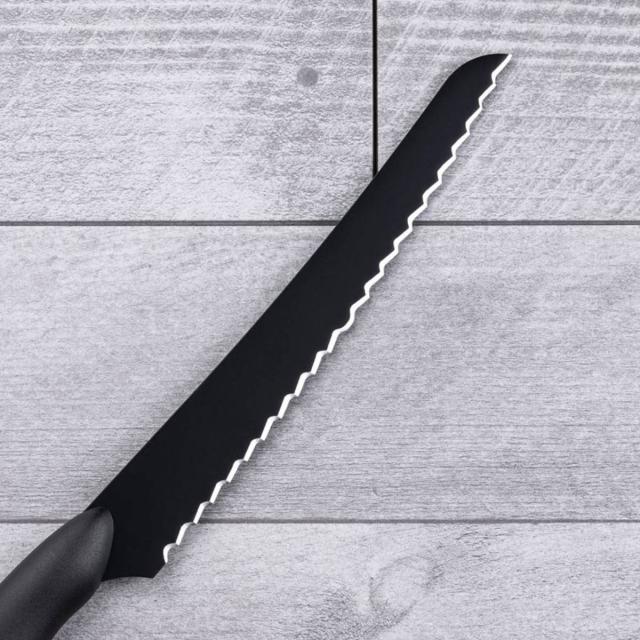 ステンレス刃物鋼でサビに強く、波刃によって柔らかいパンやケーキもキレイにカットできます。汚れが付きにくく、落としやすいコーティングも施しています。