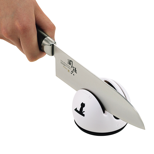 丸い球体のフォルムと猫のイラストが可愛い、コンパクトサイズの包丁研ぎ器です。底面の吸盤でピタッと固定できるので片手でも楽に研ぐことが出来ます。モノトーンで可愛いだけでなく、機能性も抜群です。