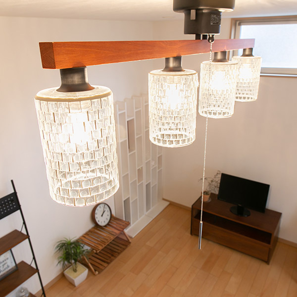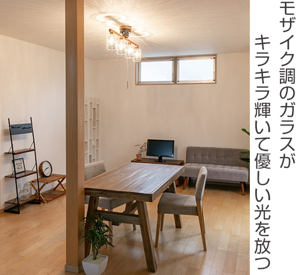 モザイク調のガラスと木製アームが組み合わさって、心地のよい落ち着ける空間を演出します。木のぬくもりと優しい光で、お部屋を明るく照らします。