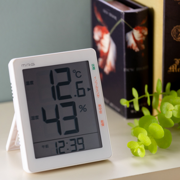 視認性の良い大きな文字で温度と湿度をデジタル表示する温湿度計です。温度と湿度のバランスからお部屋の環境目安を表示してくれる機能付きで、毎日の快適な環境作りをサポートします。ペットルームや観葉植物などの室温管理にもおすすめです。