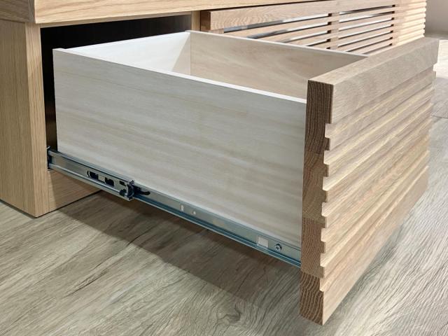 引出しはフルスライドレール仕様なのでスムーズな開閉ができ、手前までしっかり引き出せて収納物が見やすく取り出しやすいです。