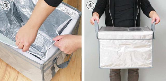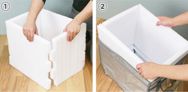 | 1.断熱材となるボード4枚(側面のみ)を組み立てます。 | 2.バッグ本体に組み立てたボードをセットし、底面のボードをはめ込みます。 |