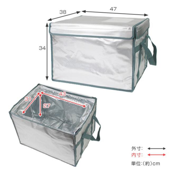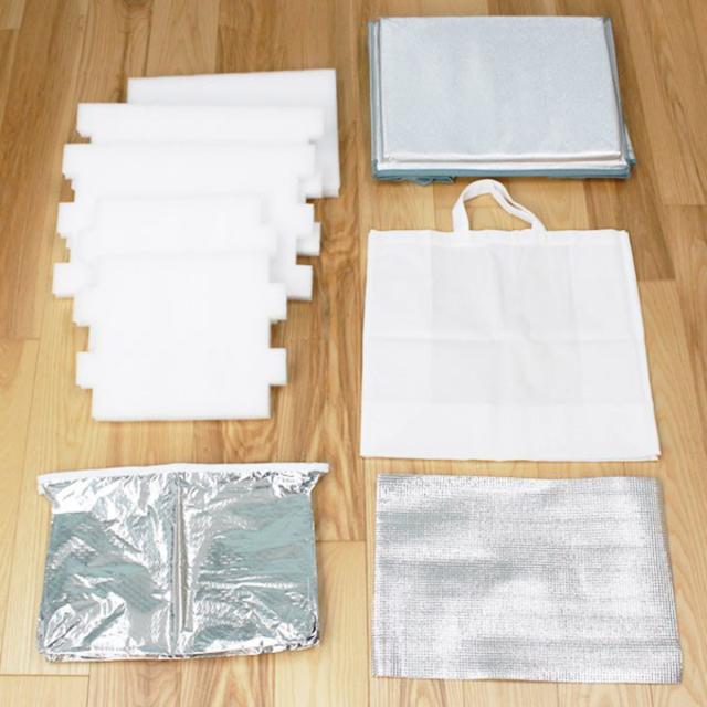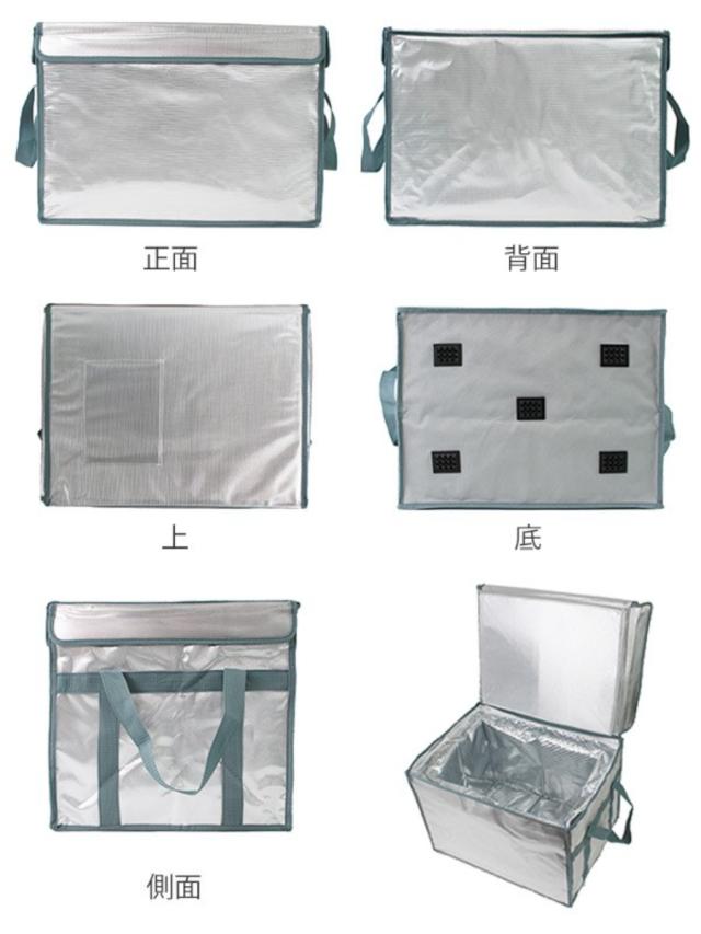 | 材質 | 本体:アルミ蒸着PVCフィルム、EPEフォーム、PVCシート、EVA、ナイロン、PEボード、PPベルト、マグネット 保冷シート:発泡ポリエチレン、アルミ蒸着フィルム 手提げ袋:ポリエステル不織布 |