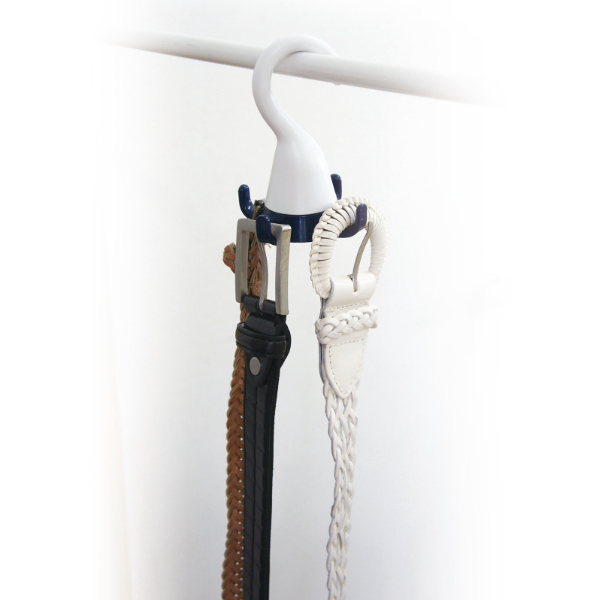 下の青いフック部分がくるくると回るので、一目でどんなベルトがあるか分かります。忙しい朝の身支度時にサッと取り出せるので、時間短縮になります。