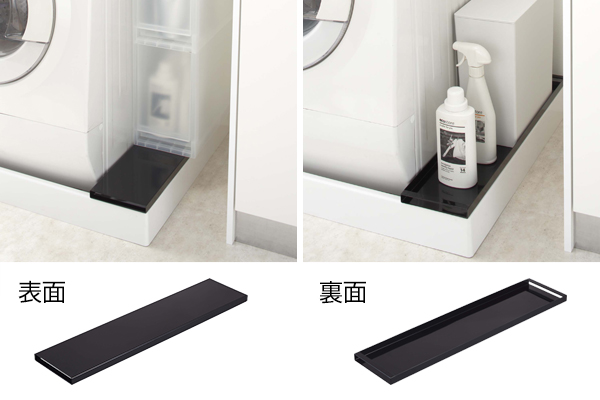 | 表面はフラットに使える 表面で使用する場合はフラットなので、収納ストッカーなどの幅のある大きいものをはみ出して置くことができます。 | 裏面はガード付き 裏面で使用する場合はガードがあるので、洗濯ボトルなどの小物を類を置いても滑り落ちてしまう心配がありません。 |