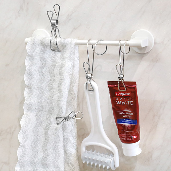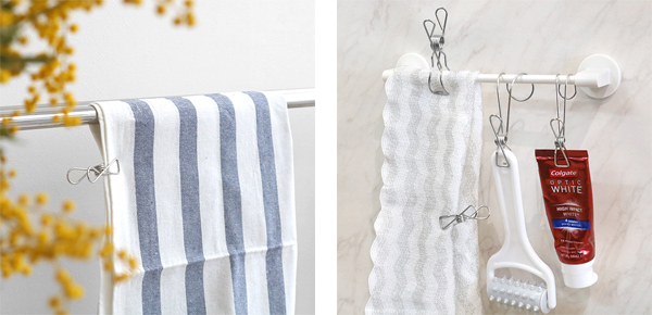 | お洗濯に 洗濯時、タオルやふきんをとめておくのに便利なピンチです。 | バスルームで 錆びに強いステンレス製なので、バスルームでの使用にも最適です。 |