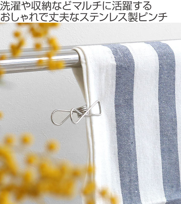 丈夫で錆びに強いステンレス製のピンチ10個入です。使い勝手が良く、洗濯はもちろん、収納など様々なシーンで活躍します。