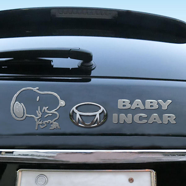 自動車の背面や側面に貼り付けるステッカータイプのセーフティーサインです。スヌーピーが赤ちゃんの乗車を後続車にお知らせしてくれます。