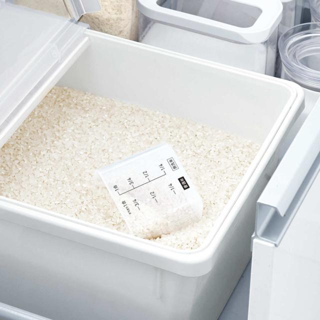 パッキン付きなので、お米を湿気・酸化から守り、鮮度を保ちます。また底面にフィットするデザインの計量カップが付属しているので、お米を最後まできっちりすくうことができます。