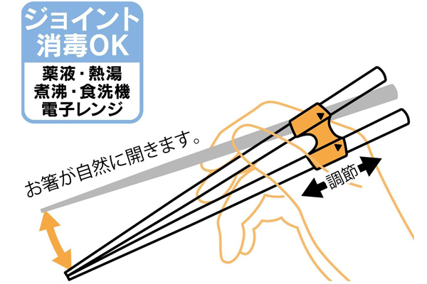 お箸の自然な持ち方をサポートするジョイント箸です。指当たりの良いシリコンジョイントを使用しており、落ちてもバラバラになるのを防ぐほか、使用される方に合わせてジョイントの位置を調節することができます。左右兼用でお使いいただけます。