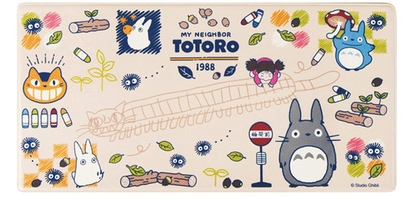 「となりのトトロ」に登場する、トトロやメイ、ネコバス、まっくろくろすけなどのかわいいイラストが描かれたPVCマットです。映画のエンディングロールシーンや特徴的なポーズをしたトトロのカットを集めた楽しいデザインです。