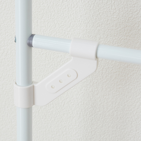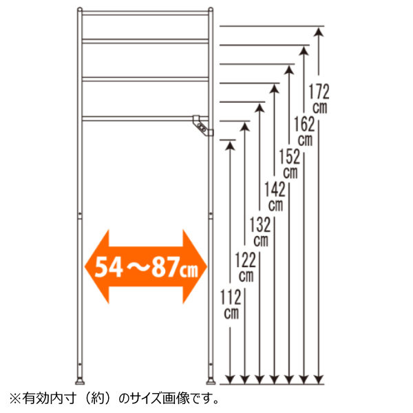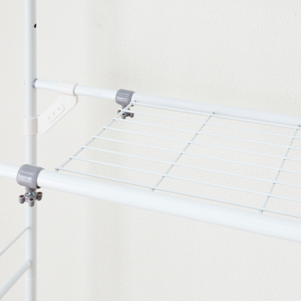 棚の高さは約112〜172cmまで、10cm間隔で伸縮ができます。幅は、60〜93cmの調整が可能です。棚のポールは、ハンガーを掛けて置ける、ちょっと掛けに便利です。