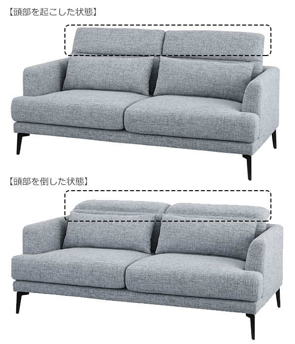 お好みに合わせて頭部の角度調節が可能です。左右別々に稼働するので、本を読んだり、映画を見たりシーンに合わせて自由にリクライニングできます。また、使用しないときは頭部を倒し、お部屋の圧迫感を軽減することができます。