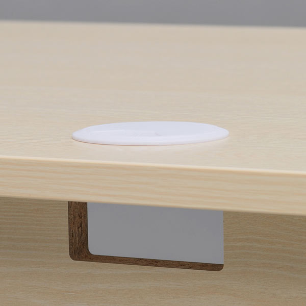 ●天板はキズのつきにくい低圧メラミン樹脂化粧、キャップ付きの配線穴があり、壁付けや対面レイアウトに対応しています。
