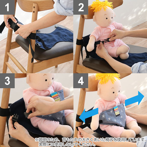 1.サポートベルトを椅子の背もたれ(または保護者のウエスト)に回してバックルを留め、ゆるみのないように調節します。