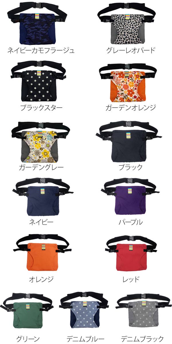 | 種類 | ネイビーカモフラージュ、グレーレオパード、ブラックスター、ガーデンオレンジ、ガーデングレー、ブラック、ネイビー、パープル、オレンジ、レッド、グリーン、デニムブルースター、デニムブラックスター |