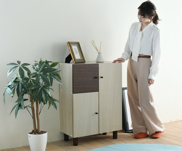 木目のあるナチュラル×ダークブラウンのツートーンで、ちょっぴりレトロな大人可愛いキャビネットです。収納部はすべて扉付きなので、たくさん収納しても扉を閉めれば見た目がスッキリ片付いた印象になります。