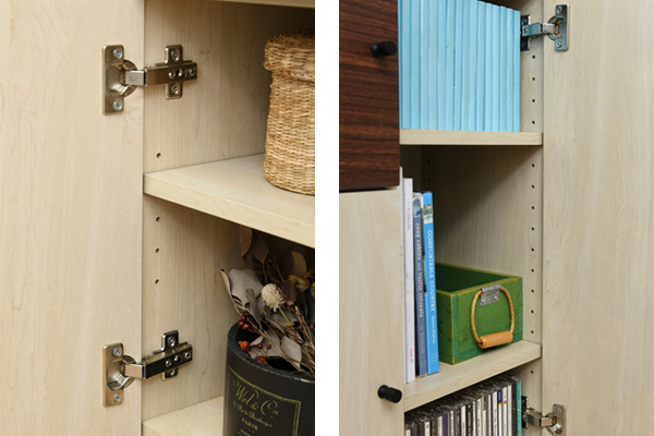| 左下収納部 棚板が1枚付いており、高さを3.2cmピッチ5段階で調節できます。 | 右側収納部 棚板が2枚付いており、高さを3.2cmピッチ15段階で調節できます。 |