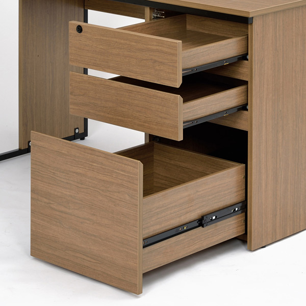 ![]() ![]() ![]() ![]() シンプルで機能的なワーキングデスク 机の上をゆったり使える奥行き700タイプです。天板はキズのつきにくい低圧メラミン樹脂化粧で耐久性に優れています。背面化粧ありで、背面が見えるレイアウトでもOK。別売の上置き棚の設置が可能です。 ![]() 便利なオールロック機構 引き出しはオールロック機構で、全ての引き出しが1度の施錠で同時にロックできます。鍵は2本付属、下段のみフルオープンです。 ![]() 引き出しに取っ手のないすっきりデザイン 引き出し正面に取っ手のない、すっきりとしたデザインです。前板両端の斜めにカットされた部分に手を掛けて引き出しを開けます。 ![]()