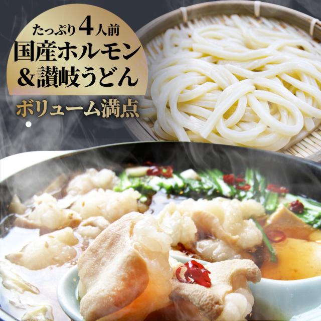 国産牛ホルモン(小腸)480g、冷凍讃岐うどん×4、鎌田醤油の濃縮めんつゆ15ml×8、おろしにんにく3g×4、鷹の爪