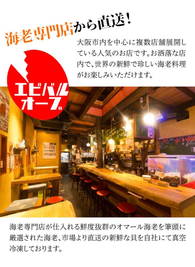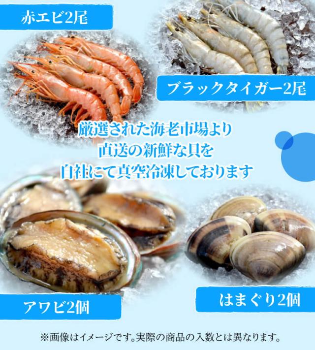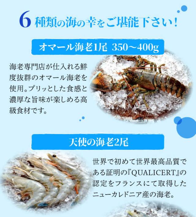 内容量:オマール海老1尾(350g)、赤海老2尾、天使の海老2尾、ブラックタイ ガー2尾、はまぐり2個、アワビ2個 ※季節、仕入れの状況によ り内容が予告なく変わる場合があります。