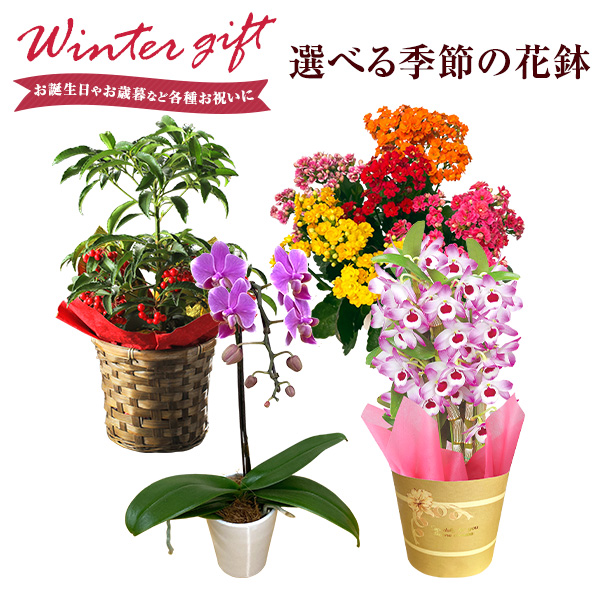 選べる季節の花鉢(デンドロビューム、カランコエ5色寄せ植え、万両、こちょうらん)、バスケット付(万両)、育て方のしおり