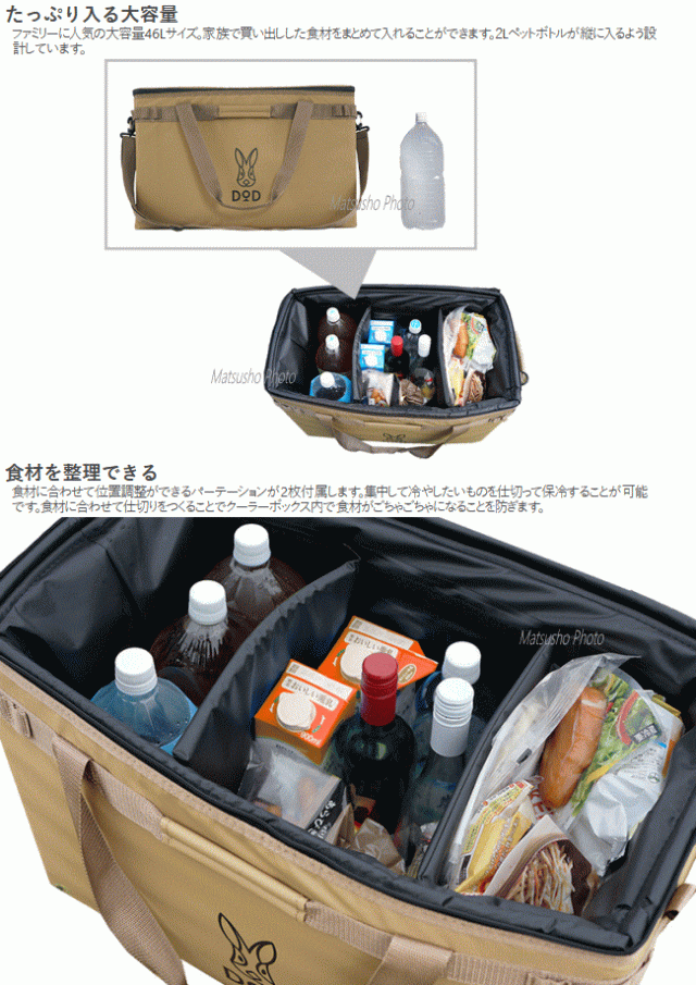軽量で持ち運びしやすい。大型サイズのソフトクーラーバッグ。食材をまとめておくのに大きいクーラーボックスが欲しい。でも重くて運びにくいのはいや。そんなあなたにおすすめの大型ソフトクーラーバッグです。ファミリーに人気の大容量46Lサイズ。家族で買い出しした食材をまとめて入れる事ができます。2Lペットボトルが縦に入るよう設計しています。食材に合わせて位置調整ができるパーテーションが2枚付属します。集中して冷やしたいものを仕切って保冷する事が可能です。極厚発泡ポリエチレンフォームを断熱材に使用。一般的なソフトクーラーバッグと比べ厚い断熱材を使用しており高い保冷性能はもちろん緩衝材としての機能も有します。肩に掛けて持ち運びできるような軽量設計です。■カラー:タン■サイズ約W58×D31×H36cm■インナーサイズ約W54×D27×H32cm■重量約2.2kg(付属品含む)■容量約46L■最大積載重量20kg■材質[アウター]ポリエステル(ラミネートPVC)[断熱材]発泡ポリエチレン[インナー]PEVA■付属品:肩掛け用ベルト、パーテーション×2※大型商品のため同梱発送不可