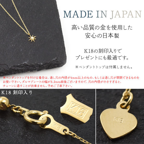 留め具もチェーンも18金で仕上げた日本製のチェーンネックレス。
