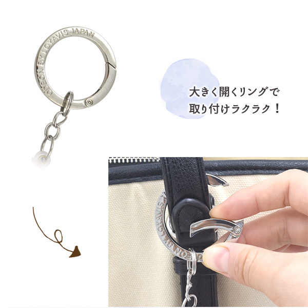 大きく口の開くリングタイプの金具で、あらゆる太さの持ち手に対応しています。