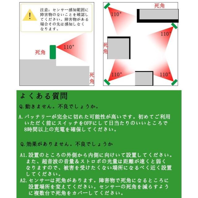 (1)二重超音波モードで、動物が検知範囲に入ると赤外線センサーが動物を感知したら、製品が超音波を発信することにより、動物に不快感を与えて撃退することができます。