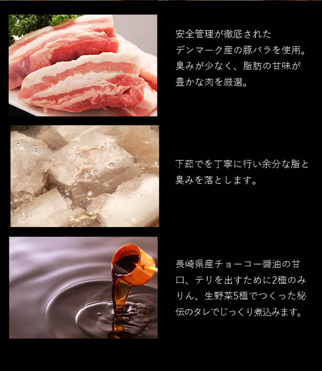 豚肉(デンマーク産)、醤油、砂糖、酒、みりん、はちみつ、野菜エキス(玉葱、人参、生姜、ニンニク、長ねぎ)、(一部に小麦、大豆、卵を含む)
