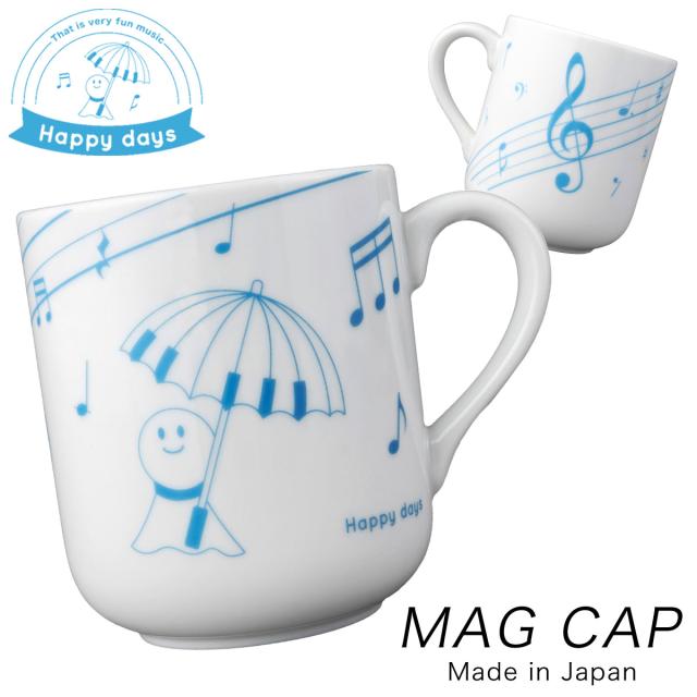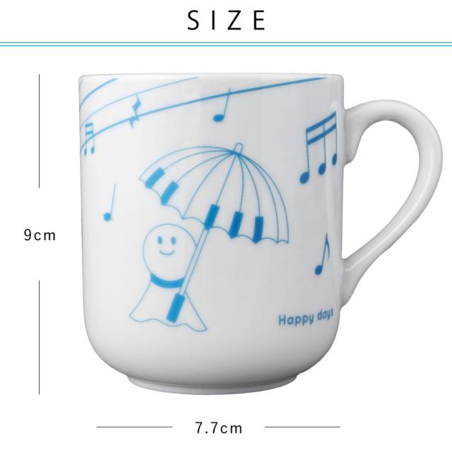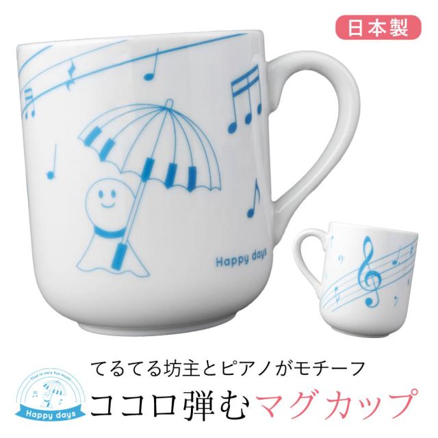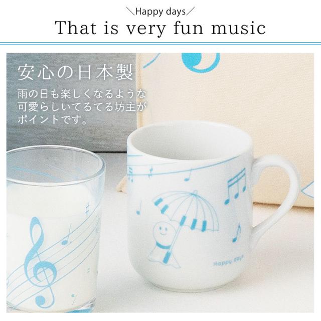雨の日も楽しくなるような心はずむハッピーデイズシリーズ。てるてる坊主と音符の楽しいデザインのマグカップ。