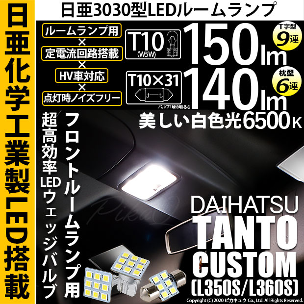 ダイハツ タントカスタム[L350S/L360S]対応 フロントルームランプ用LEDバルブ3点セット 日亜化学工業製素子使用 T10 日亜3030 9連 T字型 LEDウエッジバルブ 150lm 2個 T10×31 日亜3030 6連 枕型 LEDフェストンバルブ 140lm 1個 LEDカラー:ホワイト 色温度:6500K | ||||