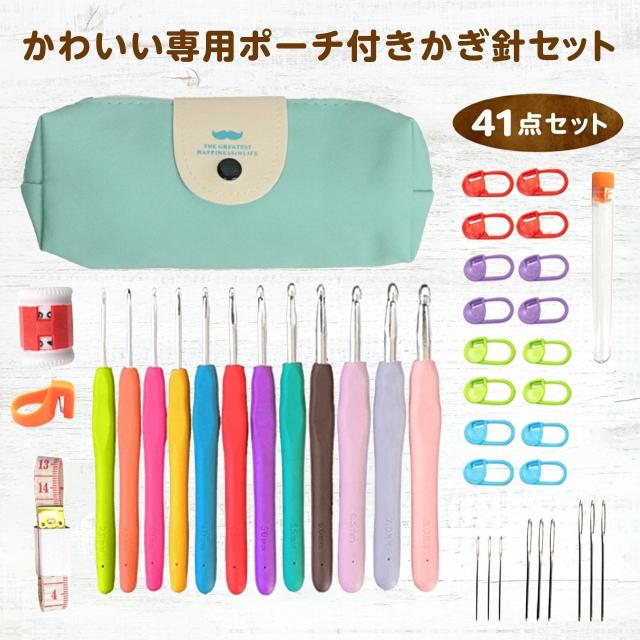 かぎ針 41点セット かわいい専用ポーチ付き かぎ針セット 初心者も嬉しい、かぎ針編み道具41点のお得なセットです。 ・ソフトグリップは手に優しくフィットして持ちやすい形状、長時間使っても疲れにくい仕様です。 ・糸が外れにくく、引きやすい、目が落ちにくい形状の針先。 ・各サイズで色分け!見た目もポップで管理がしやすい。 ・号数の表記が掘ってあるため、擦れ消えて太さがわからなくなることがありません。 ・とじ針は高品質なステンレスを採用、曲がりにくく滑らか、耐久性に優れています。 ・カギ針を収納できるレザーケース(PUレザー)と編み物小物付き。 ・ケースはかぎ針編みとアクセサリーが全て保管でき、コンパクトで持ち運びにも便利。 ・ケースはピンクとブルーからお選びいただけます。 |