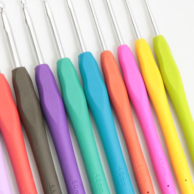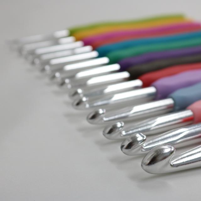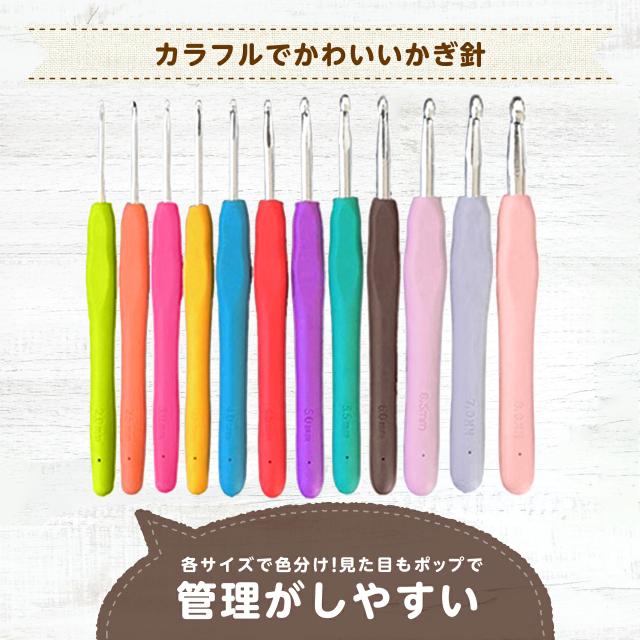 針、ゴム/鉄 ソフトグリップ付きかぎ針 12本(2号〜8号) 2mm、2.5mm、3mm、3.5mm、4mm、4.5mm、5mm、5.5mm、6mm、6.5mm、7mm、8mm 付属品:メジャー、段数カウンター、糸切カッター、段数マーカー×16個、とじ針×9本、収納ケース(ブルーまたはピンク) |