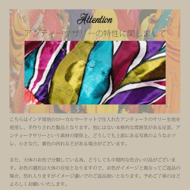 | クオリティにつきまして | こちらはアンティークサリーを素材として、ハンドメイドしている製品です。インド現地クオリティ品となりますので、ほつれや縫製の甘さ、小傷、スレや小さな穴等ある場合がございます。予めご了承くださいませ。 |