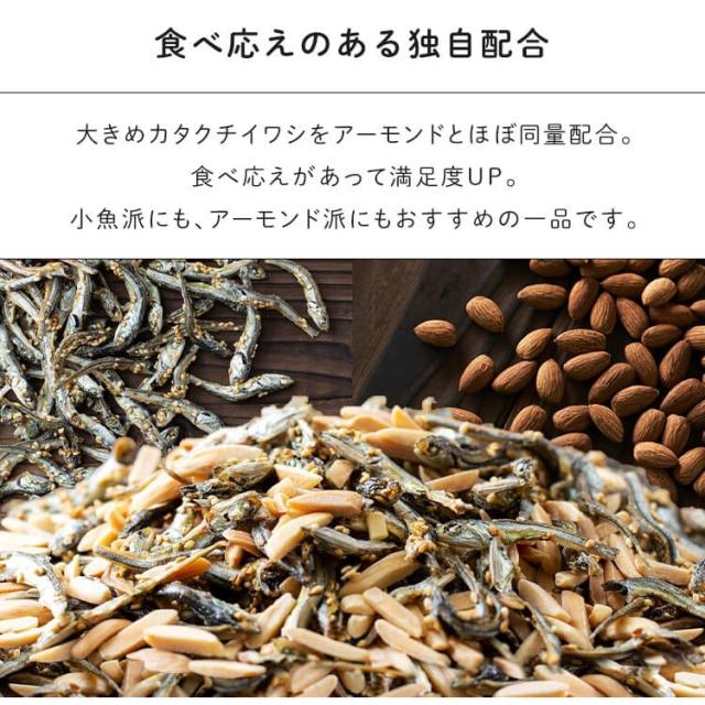 煮干し(いわし、食塩)、アーモンド、砂糖、ごま、しょうゆ、澱粉分解物、食塩/調味料(アミノ酸等)、(一部に小麦・大豆・アーモンド・ごまを含む)