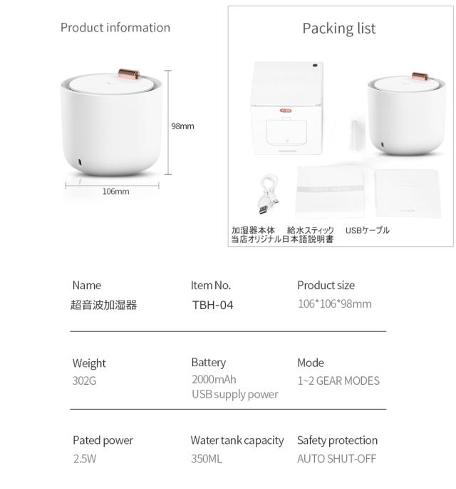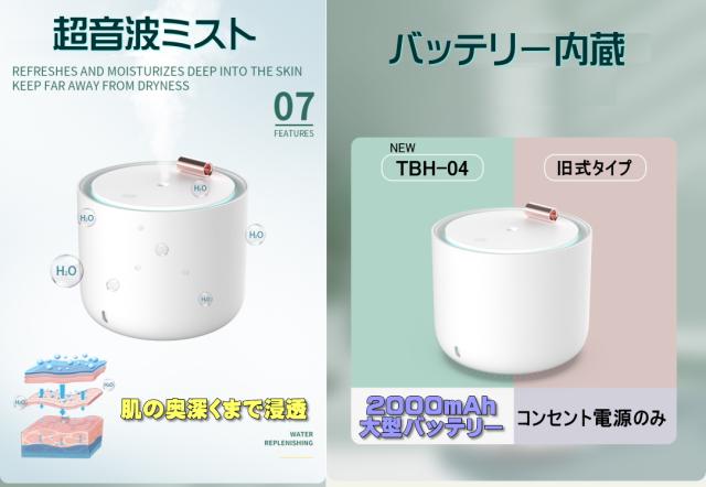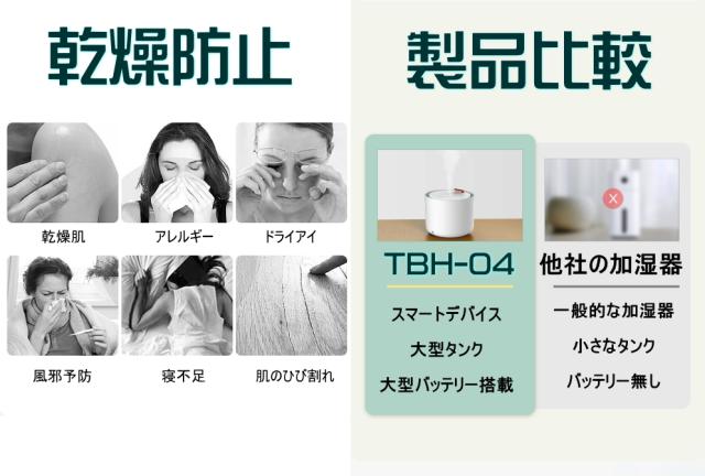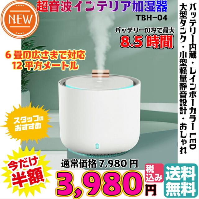 送料無料 税込み 最新 TBH-04 超音波加湿器 エコ 静音 おしゃれ 肌乾燥対策 超音波式加湿器 ミニ加湿器 卓上 オフィス デスク 大容量 小型 充電式 コンパクト